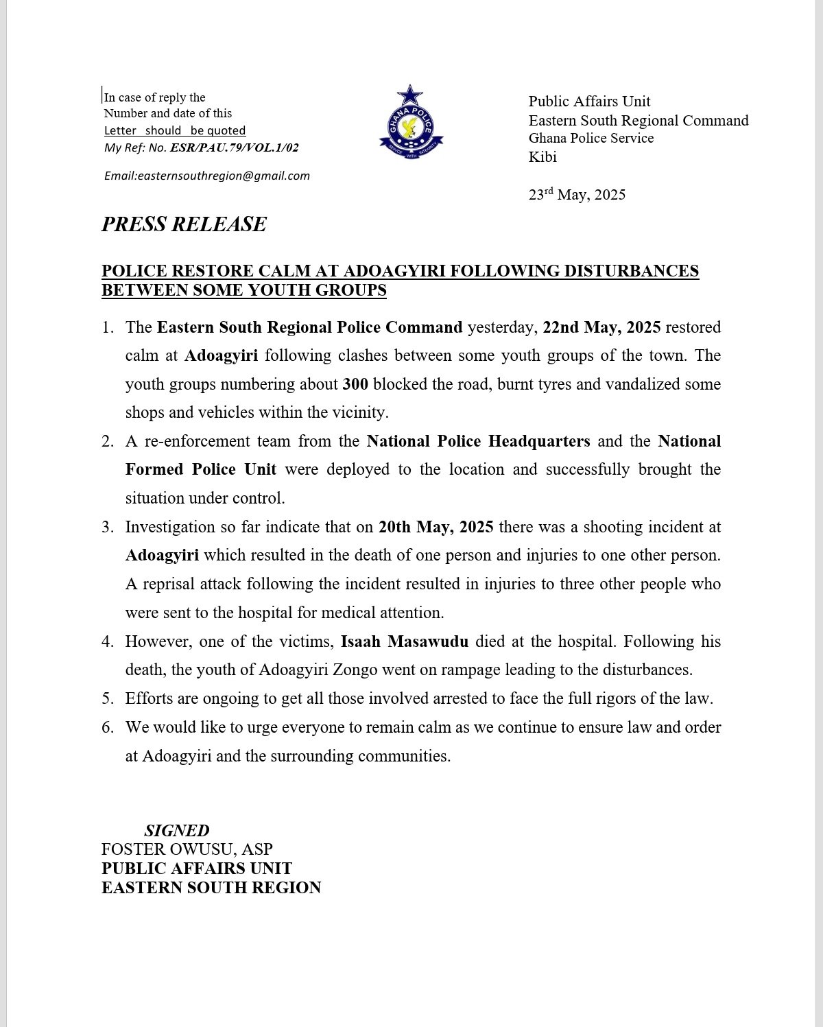 The Eastern Regional Police department through their public affairs unit published a press release earlier today having it...