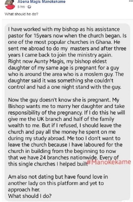 His bishop, he says, asks him to marry his eldest daughter who is pregnant for another man just because the man is pregnant.