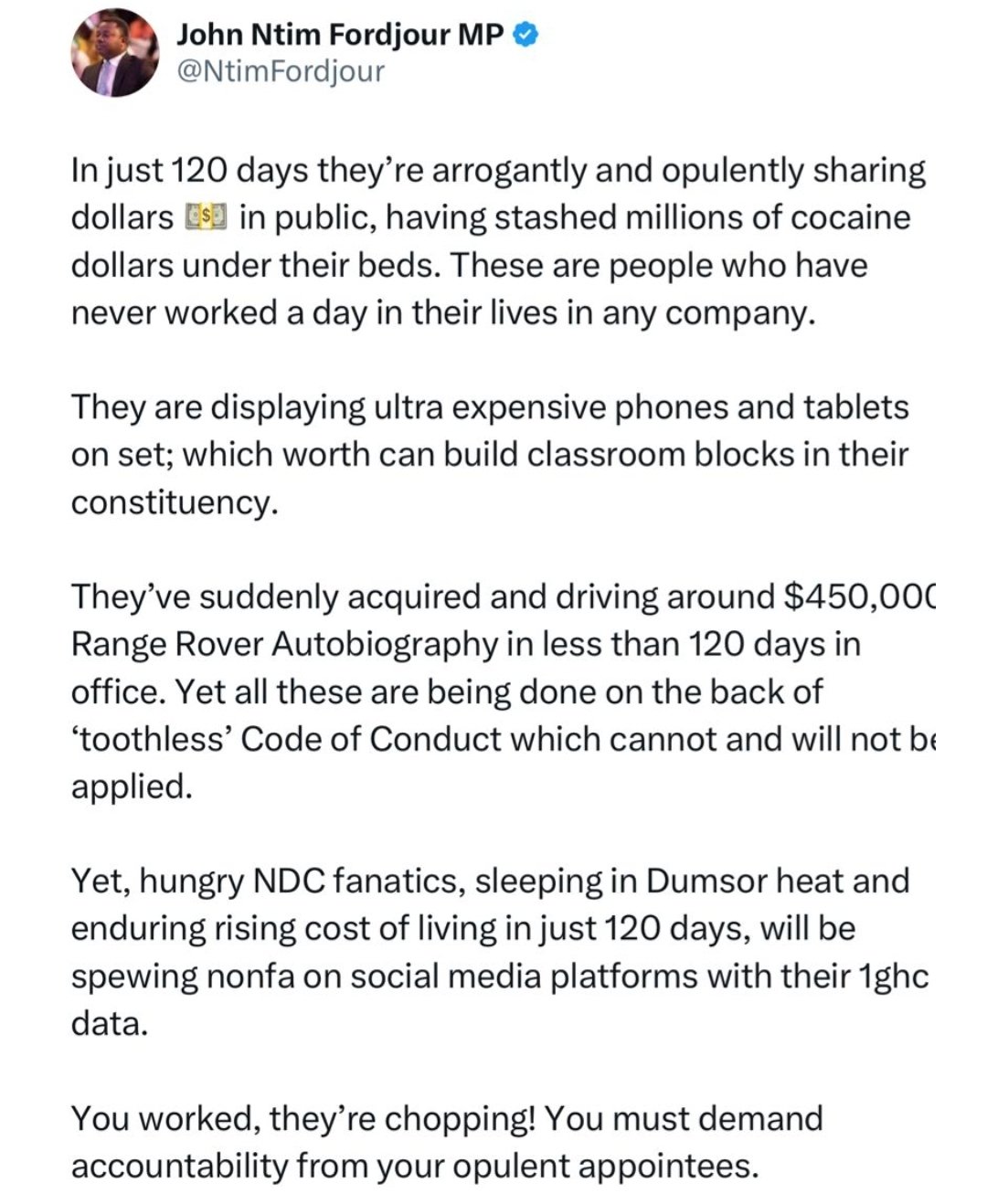 In a strongly worded social media post, Fordjour alleged that certain individuals, whom he claims have never had formal employment are already flaunting expensive gadgets and luxury cars, including a $450,000 Range Rover Autobiography.